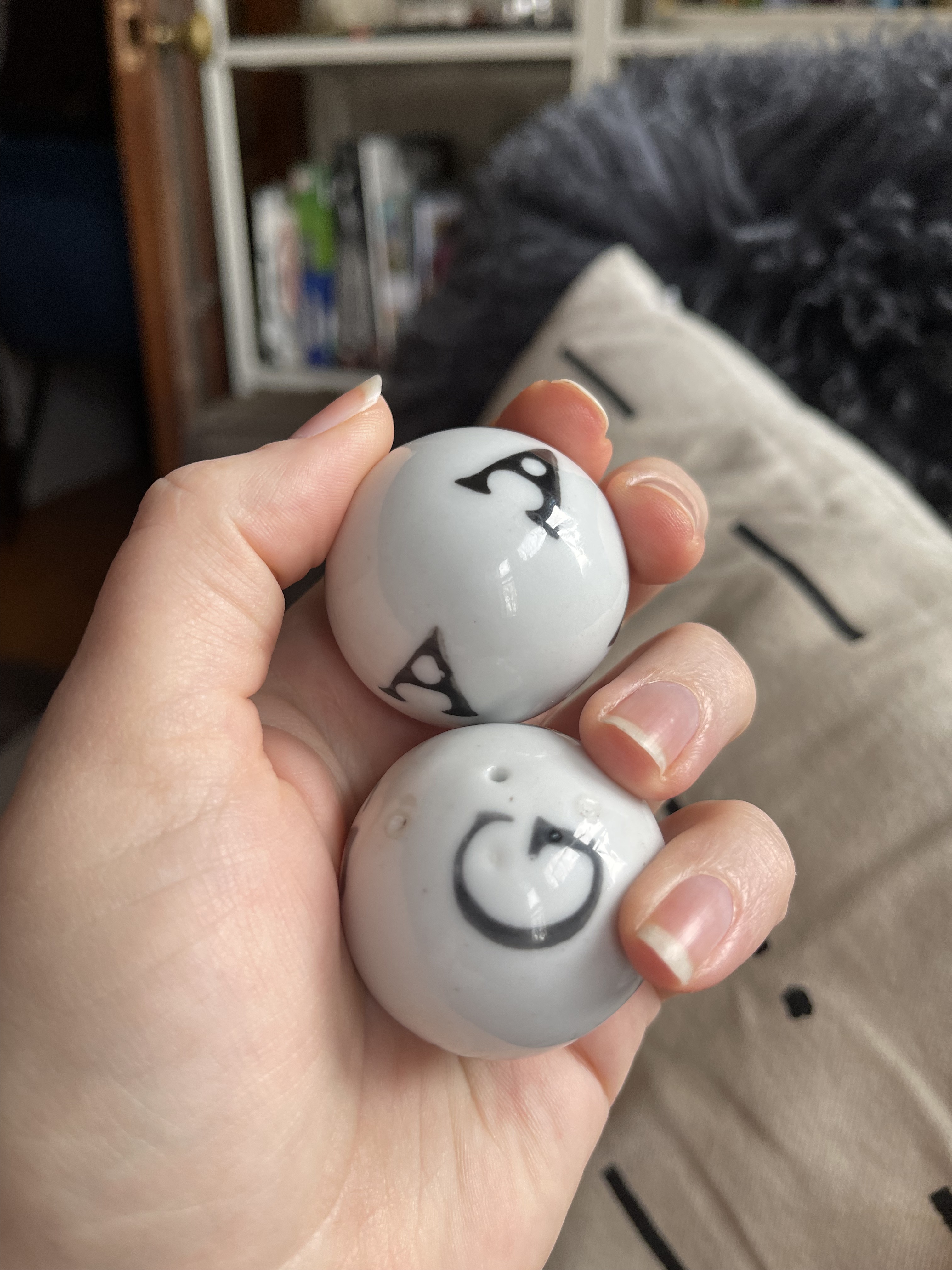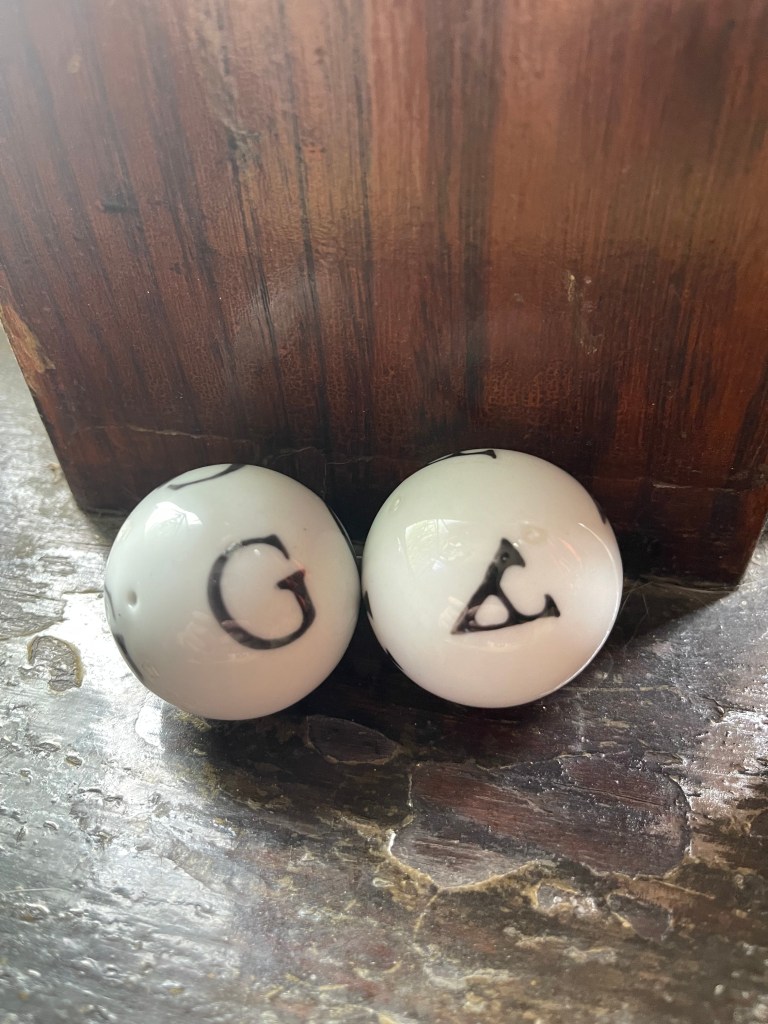 These are my 2 cast ceramic glazed orbs printed with black typeface letters on a white background. One ball has an “A” on it and the other a “G.” They are decorative items with no real purpose.