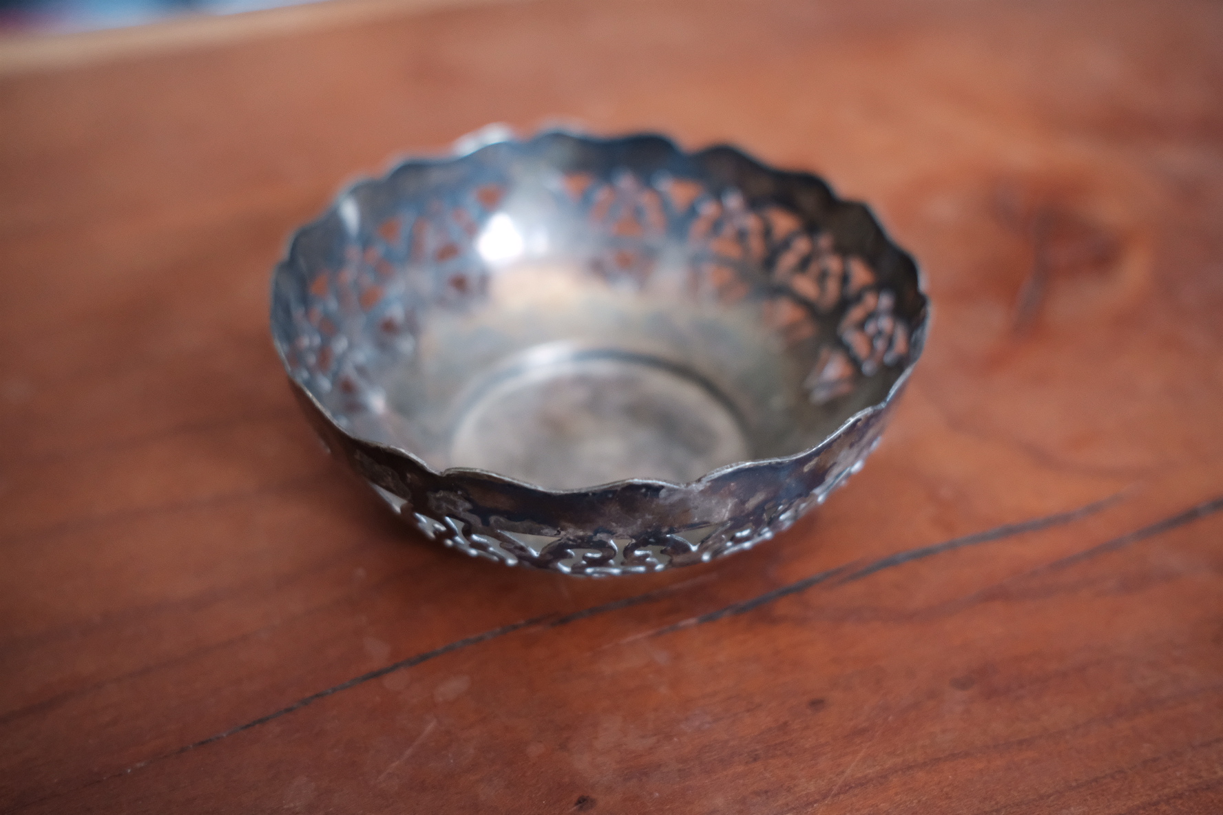It’s considered to be holloware. This small silver-plated bowl is pierced with a repeating pattern of what looks to be a fleur-shaped heart. It has a small foot that has an interior depression. This bowl could have been used for nuts or candies. Holloware, otherwise known as hollowware and hollowware, is any item that is not flatware. Holloware includes all different types of tableware items and silverware items. These items include candlesticks, teapots, coffee pots, creamer sets, pitchers, platters, etc. Holloware was a traditional gift for weddings and anniversaries. Many families have pieces like these passed down between generations.